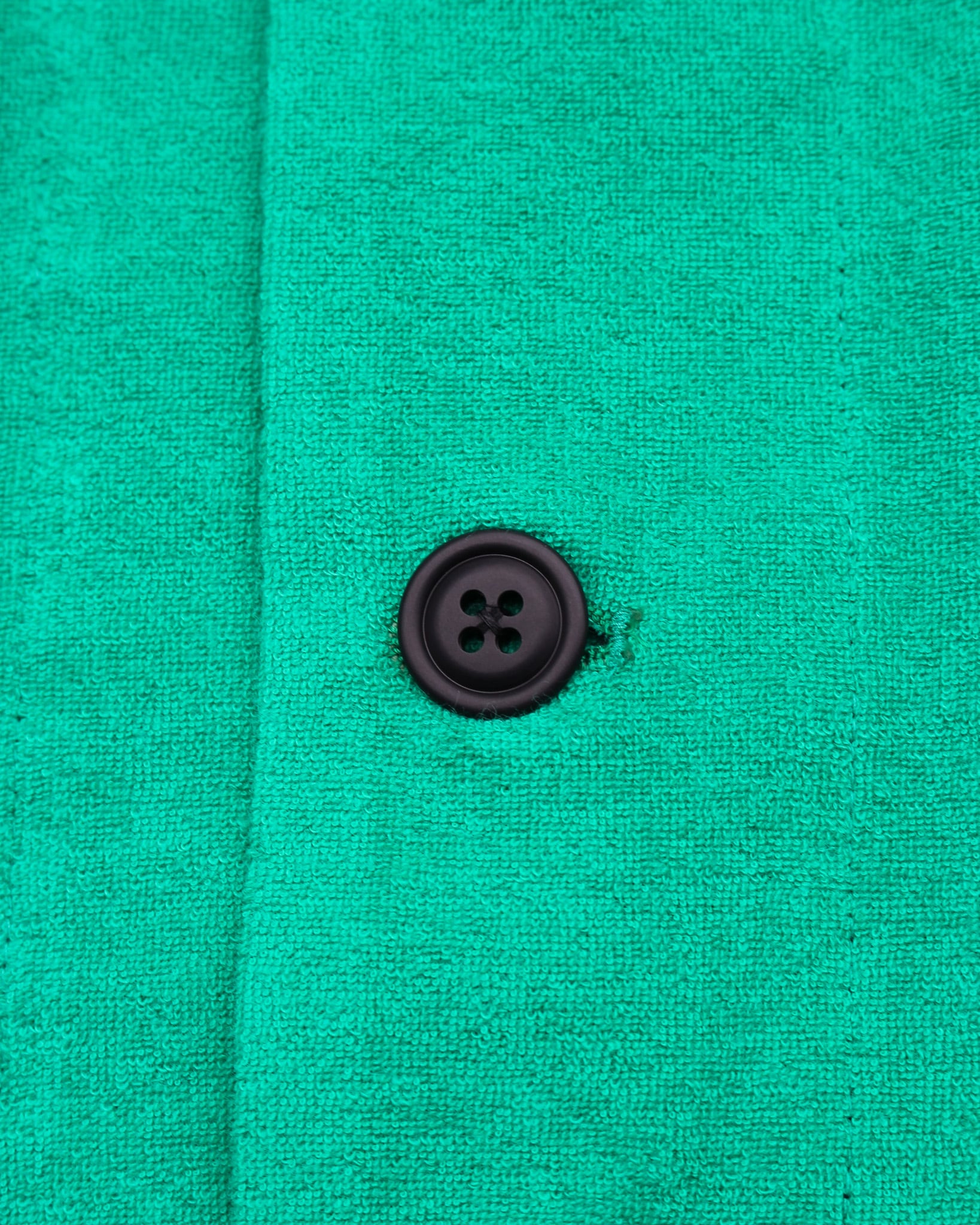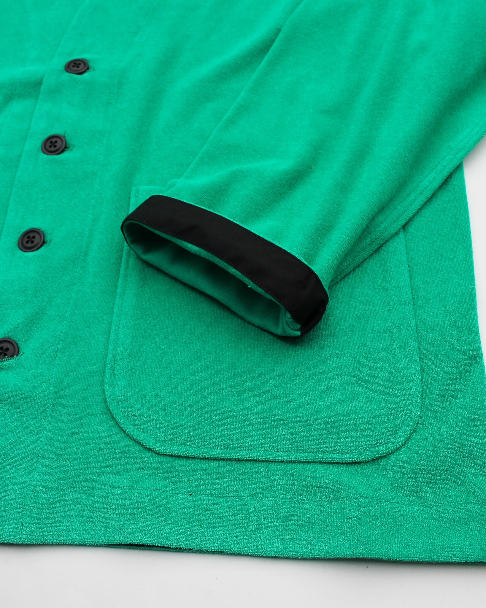 • デザイン:Vネック/フロント5ボタン/大きめパッチポケット。前立てや袖口の見返し仕様と、さりげないボタンホールのステッチが上品なアクセント。
