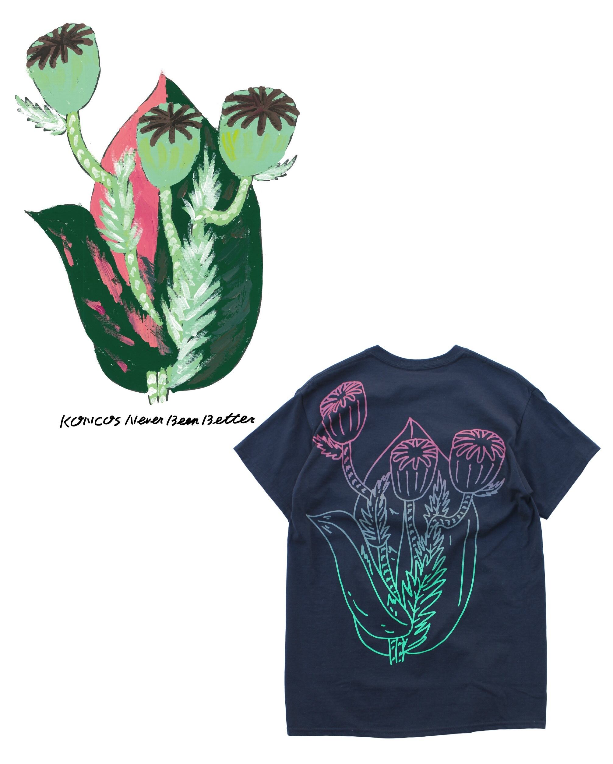 KONCOSの8/12にリリースされるNever Been BetterをイメージしたTシャツを制作しました。真っ暗闇で今を叫ぶ曲に合わせてForagerのちーこさんにお花をアレンジしてもらい、僕がイラストに落とし込みました。プリントは仙台AZOTHさん。