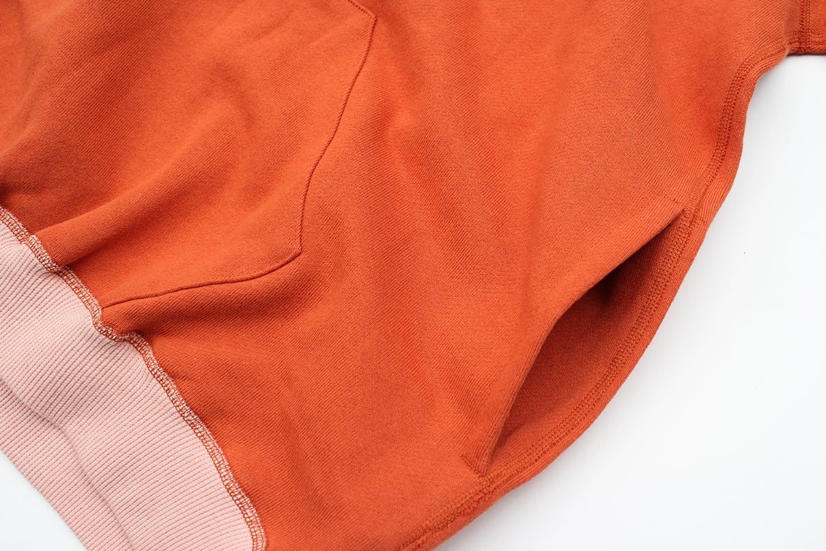 縫製の都合上、カンガルーポケットが大き過ぎるとシームポケットが浅くなってしまう、シームポケットを深くしすぎるとカンガルーポケットが不自然な小ささになってしまう為、一番ベストだと思う所に着地しました。