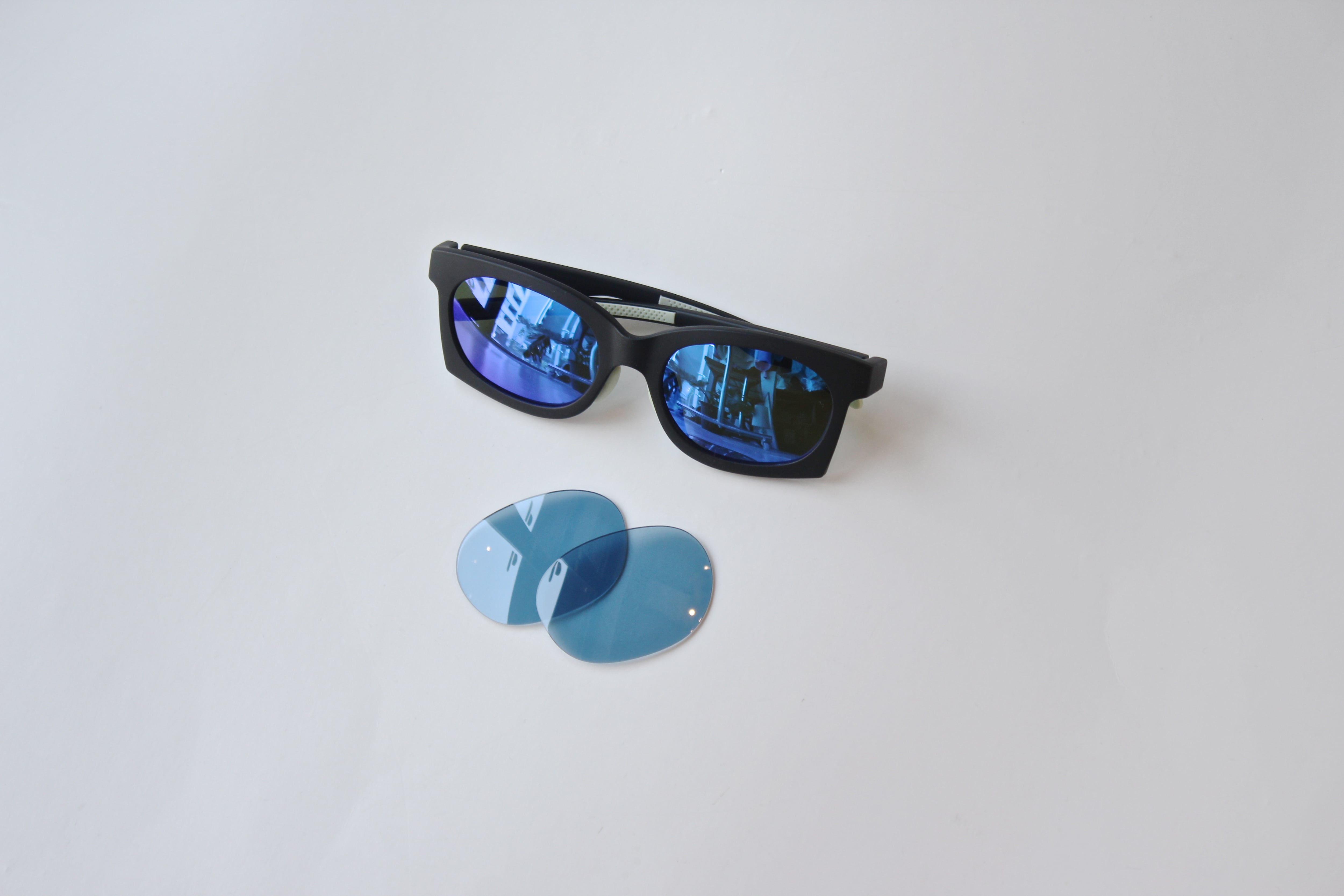 着用を忘れるような軽い掛け心地、テンプルのバネ感、 激しい動きの中でも非常にずれにくいグリッフなどのス ポーツグラス の機能性を持ちつつ、モタンでカジュアルなデザインを 採用しています。レンズは 99% 紫外線カット・日光の照り返しを軽 減する偏光レンズを使用し、さまざまなシーンに合わせ て入れ替えられるよう、少し目の見えるものとフルミラー の二種類のレンズが付属しています。マットのフルブラッ クフレームに、繊細な色味のペールターコイズのクリップ がアクセントとなります。エッジのスクエアシルエットがモ ダンなウェリントン型。
