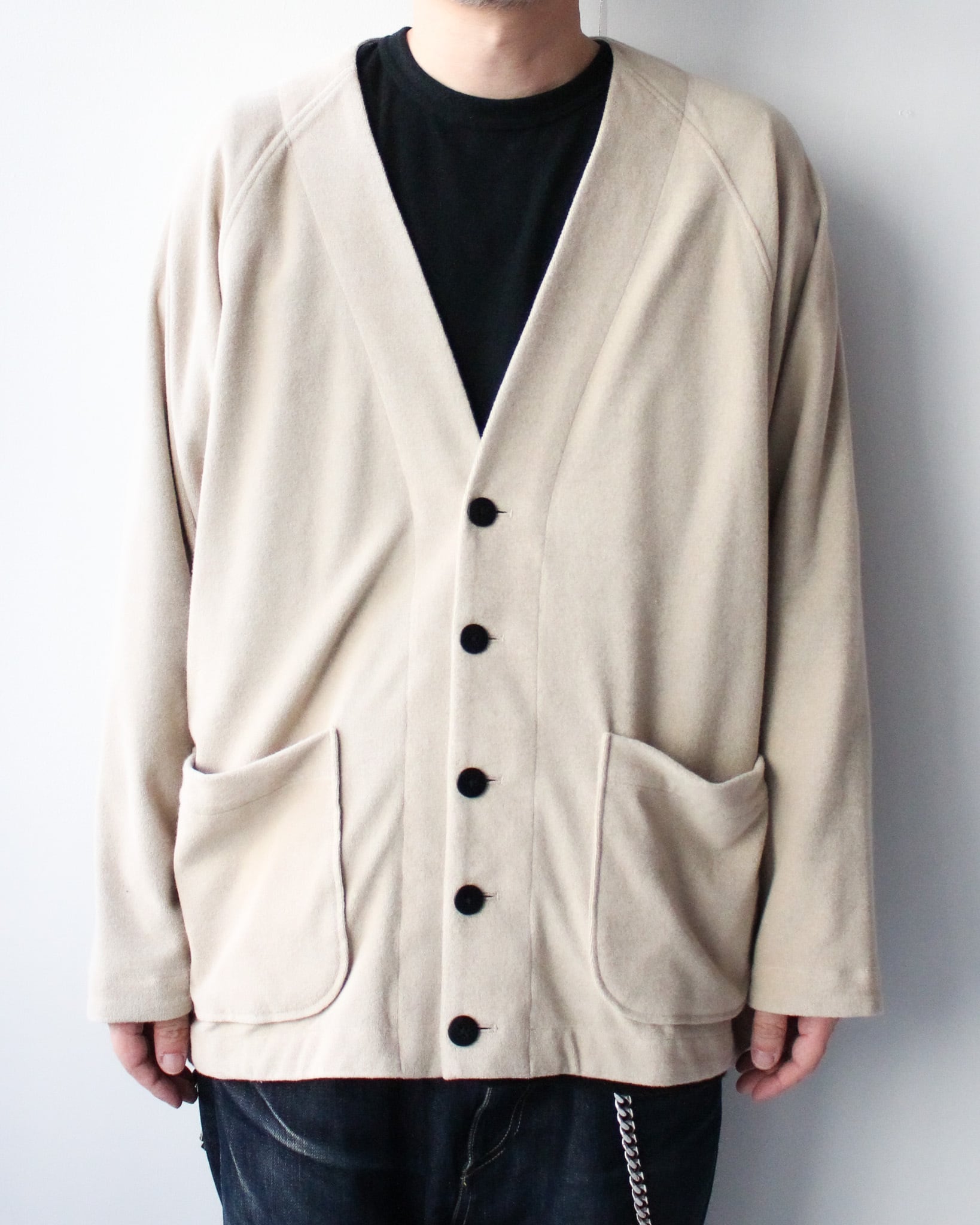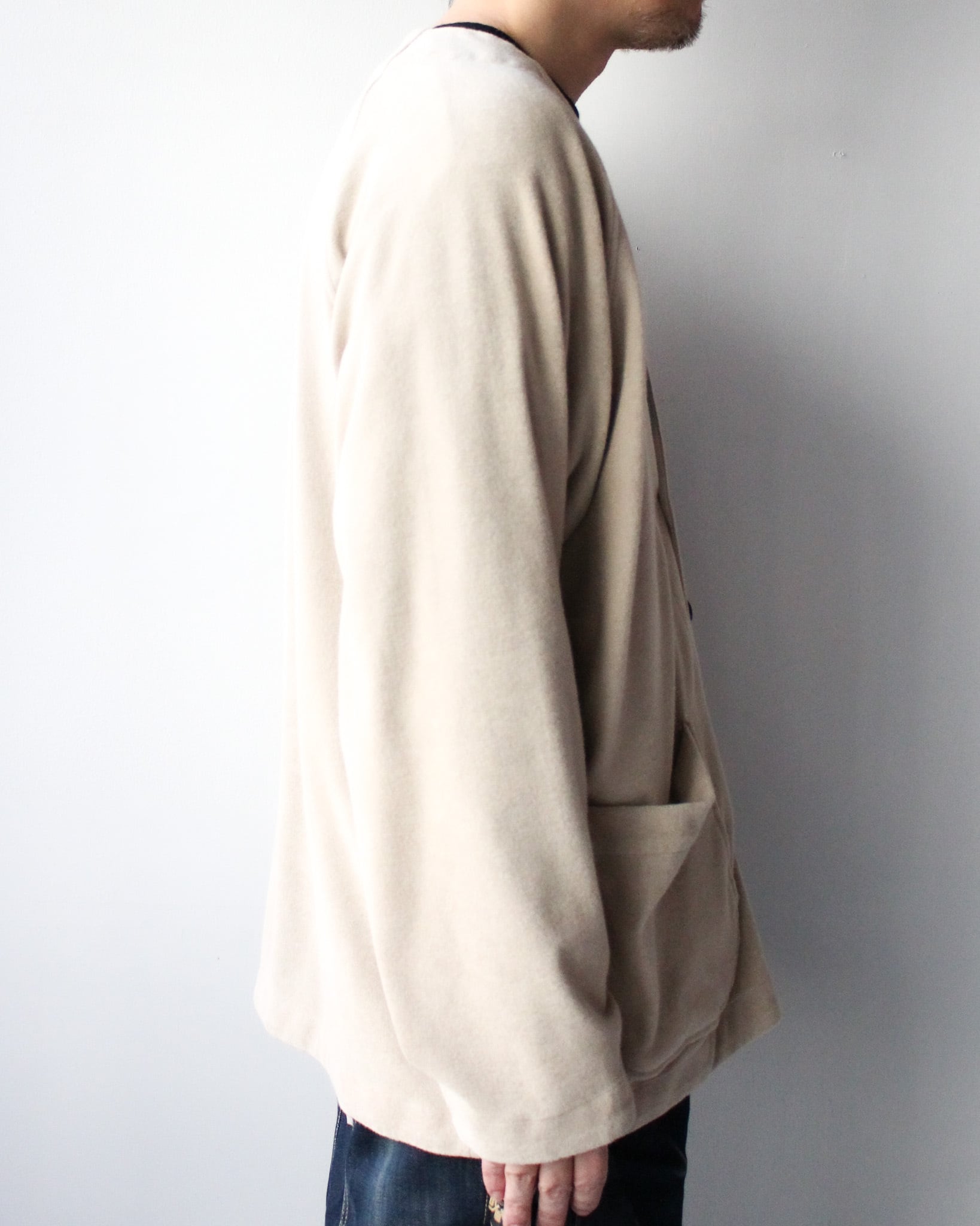 • デザイン:Vネック/フロント5ボタン/大きめパッチポケット。前立てや袖口の見返し仕様と、さりげないボタンホールのステッチが上品なアクセント。