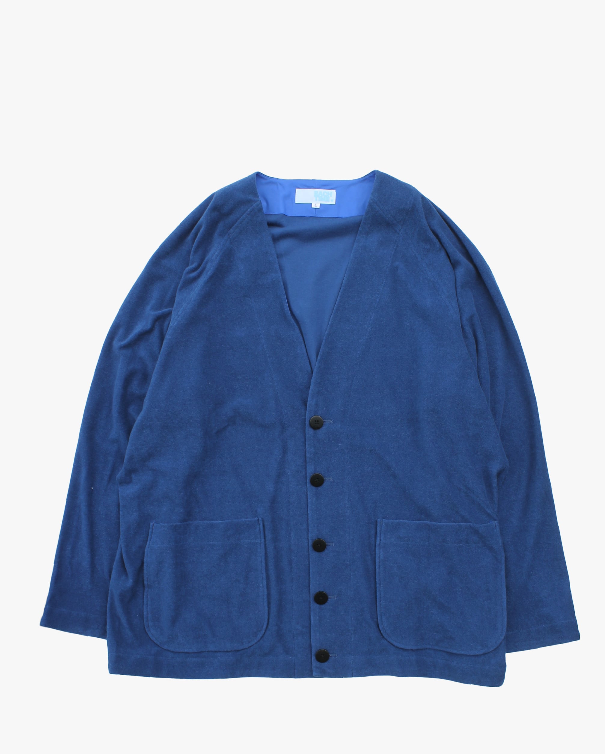 • デザイン:Vネック/フロント5ボタン/大きめパッチポケット。前立てや袖口の見返し仕様と、さりげないボタンホールのステッチが上品なアクセント。
